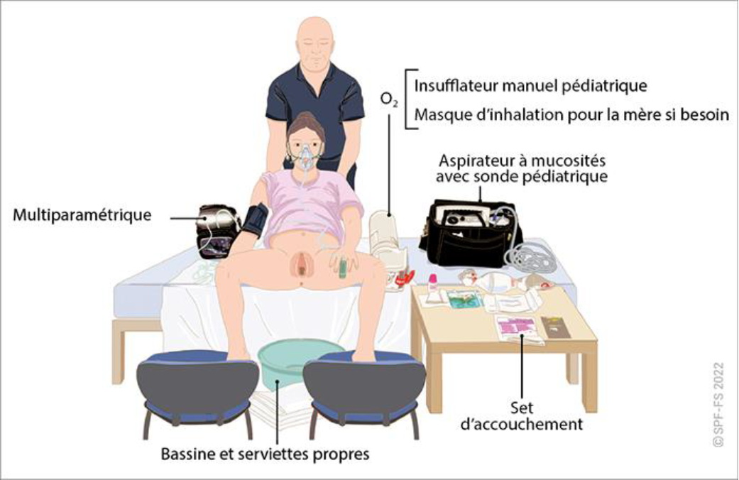 • avoir à portée de main le matériel nécessaire à une éventuelle réanimation du nouveau-né (coin bébé) :