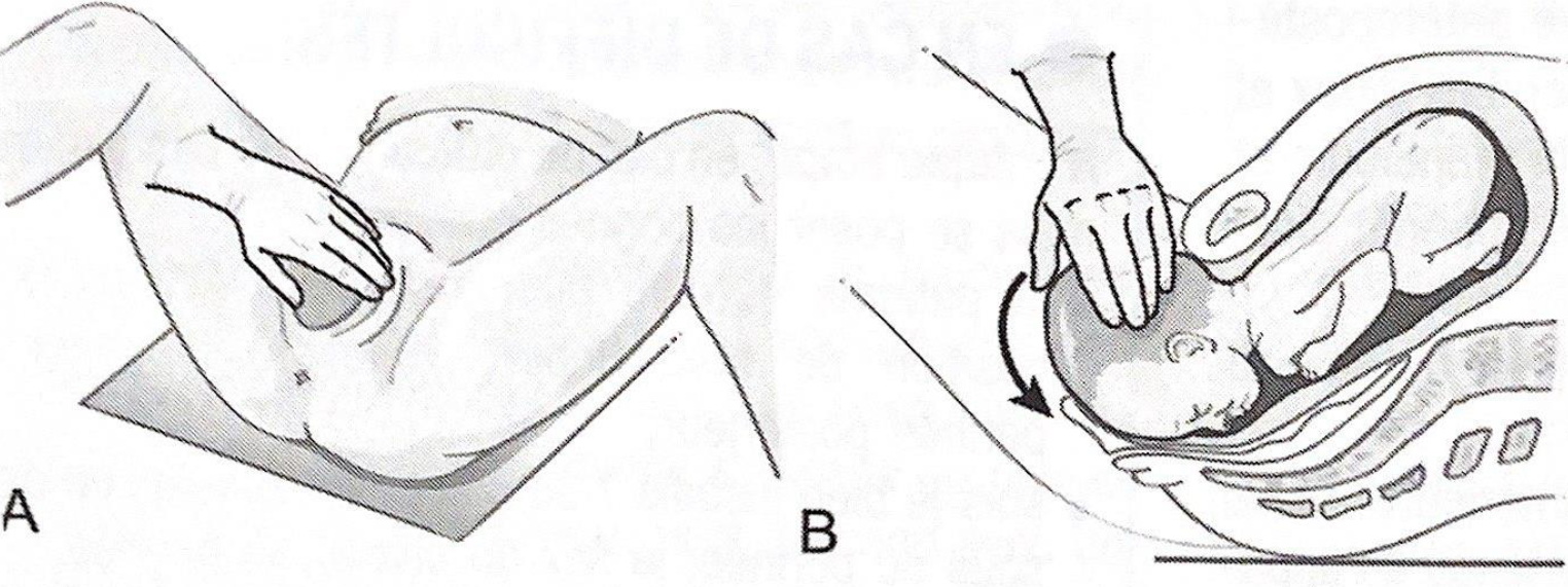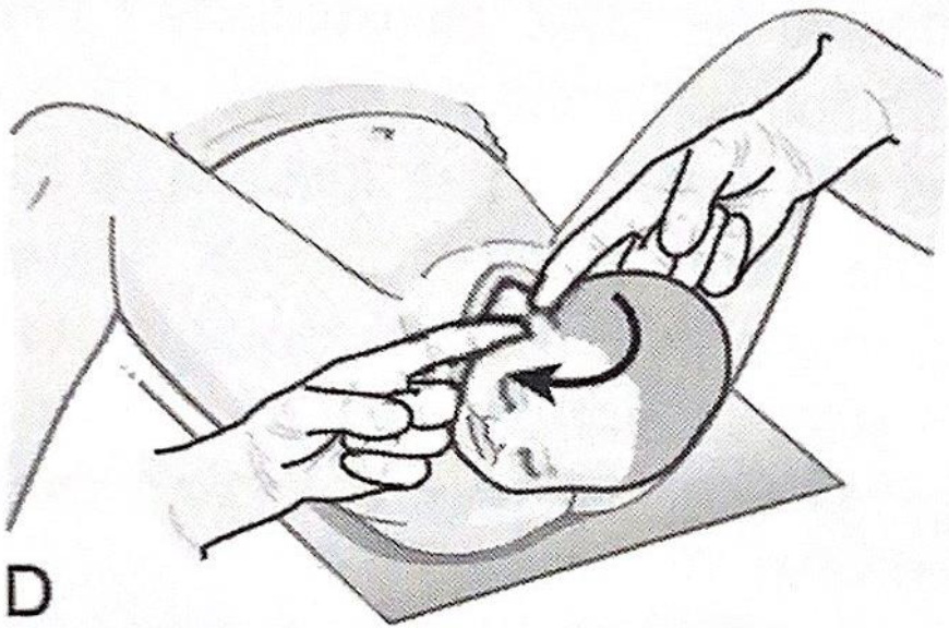 • maintenir la tête du nouveau-né avec les deux mains sans s'opposer à sa rotation au cours de sa descente (généralement la tête regarde vers le bas puis effectue une rotation d'un quart de tour sur la droite ou la gauche au cours de sa sortie),